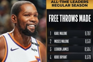 在本場比賽中,杜蘭特的生涯罰球命中數(shù)超越杰里-韋斯特,上升至NBA歷史第九位。