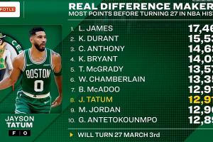 塔圖姆27歲前得分12911,超越喬丹排名榜單第八,他將在3月3日年滿27歲