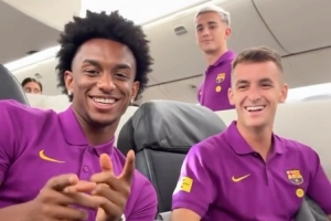 巴薩啟程前往日本,開啟亞洲行,俱樂部社媒曬出球員們在飛機內的視頻,拉什福德喝果汁+刷手機,阿勞霍、拉菲尼亞等多位球員玩游戲,氣氛輕松歡樂。