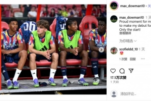 體育資訊7月25日訊 阿森納小將道曼更新社交媒體,表達了對完成一線隊首秀的激動之情。