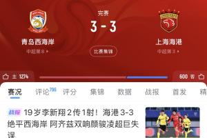 體育資訊07月26日訊 中超第18輪,青島西海岸客場(chǎng)2-2逼平上海海港,邵佳一帶隊(duì)本賽季兩度戰(zhàn)平海港(首回合主場(chǎng)3-3海港)。另外,本周中足協(xié)杯青島西海岸120分鐘2-2戰(zhàn)平北京國(guó)安,點(diǎn)球遺憾告負(fù)。