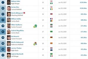 阿森納隊(duì)內(nèi)身價(jià)排名(單位:歐元/數(shù)據(jù)來(lái)源德轉(zhuǎn)):