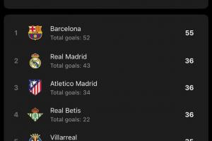 同時(shí),巴薩本賽季西甲打進(jìn)52球也是斷層領(lǐng)先,第二的皇馬打進(jìn)43球,馬競(jìng)和比利亞雷亞爾打進(jìn)34球并列第三。
