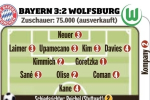 體育資訊1月19日訊 德甲第18輪比賽,拜仁主場3-2擊敗沃爾夫斯堡,《圖片報》對兩隊球員進行了評分,格雷茨卡、阿穆拉1分最高。