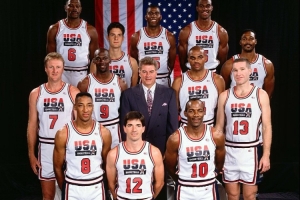 當(dāng)年美國籃協(xié)率先公布了一份10人名單:?jiǎn)痰?、“魔術(shù)師”約翰遜、拉里-伯德、查爾斯-巴克利、皮蓬、卡爾-馬龍、帕特里克-尤因、大衛(wèi)-羅賓遜、約翰-斯托克頓、克里斯-穆林。最后兩個(gè)名額歸屬于“滑翔機(jī)”德雷克斯勒和大學(xué)生球員克里斯蒂安-萊特納,主教練則是傳奇名帥查克-戴利。