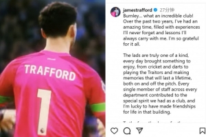 體育資訊7月30日訊 曼城已經(jīng)官宣簽回22歲門將特拉福德,后者也通過社媒發(fā)文告別伯恩利: