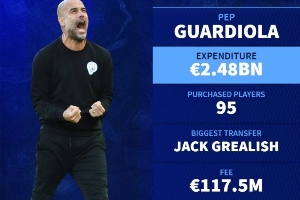 1-瓜迪奧拉,24.8億歐,簽下95人,格拉利什最貴,1.175億歐