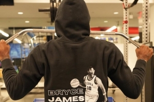 詹姆斯曬出了一組個人訓(xùn)練照,在其中多張照片中,他身穿印有小兒子布萊斯形象的定制連帽衫。