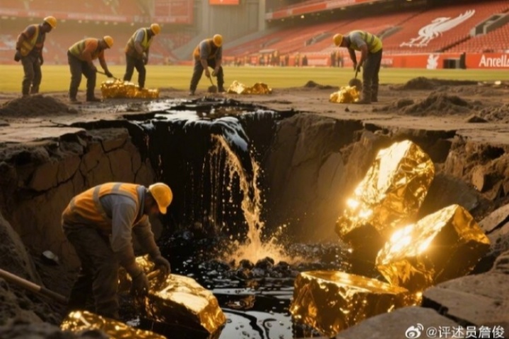 知名評述員詹俊對此評論道:“超過一億英鎊的首份報(bào)價被拒,紅軍球迷還得繼續(xù)挖坑才行......”并曬出了一張AI生成的“利物浦球場下挖石油和金礦”配圖。