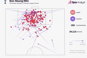 據(jù)Opta統(tǒng)計,2015-2016賽季孫興慜加盟熱刺以來,他在英超聯(lián)賽中參與198球,同期僅少于薩拉赫(270球)和凱恩(231球)。