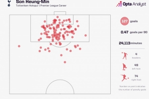 體育資訊8月2日訊 孫興慜將在今夏離開熱刺,Opta統(tǒng)計(jì)了他在英超的進(jìn)球數(shù)據(jù)。