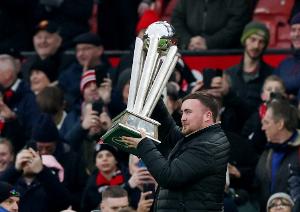 體育資訊1月19日訊 在曼聯(lián)本輪對(duì)陣布萊頓的中場(chǎng)休息期間,飛鏢世界冠軍利特爾在老特拉福德展示獎(jiǎng)杯。