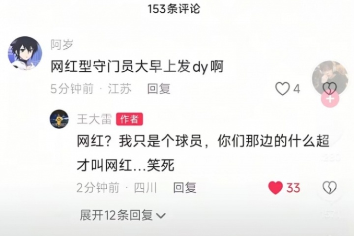 該網(wǎng)友評(píng)論:“守門員大早上發(fā)dy啊”。王大雷隨后回復(fù):“網(wǎng)紅?我只是個(gè)球員,你們那邊的什么超才叫網(wǎng)紅...笑死”。