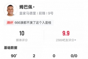 體育資訊1月20日訊 西甲第20輪,皇馬主場4-1拉斯帕爾馬斯。本場比賽姆巴佩首發(fā)出戰(zhàn),貢獻2粒進球,送出5次關鍵傳球,盡管有14次丟失球權是全場最多,但仍獲評全場最高的10分。