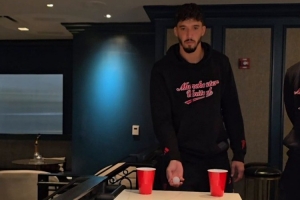 曼聯(lián)球員們進行擲球比拼,將乒乓球投入杯子中,齊爾克澤展現(xiàn)了驚人的準確度。