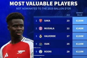 體育資訊8月8日訊 2025年金球獎候選名單出爐,德國轉(zhuǎn)會市場統(tǒng)計(jì)了未獲提名球員的身價(jià),并列出榜單,薩卡、穆西亞拉、巴爾韋德前三位。