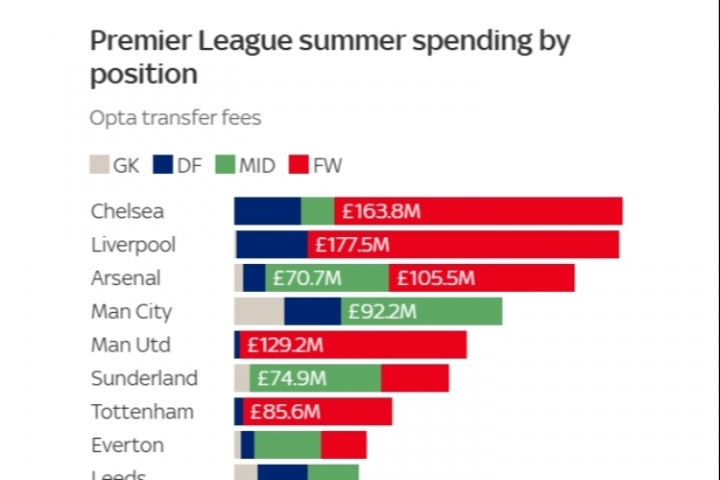 體育資訊08月08日訊 今夏英超聯(lián)賽在轉(zhuǎn)會(huì)市場(chǎng)上投入巨大,天空體育統(tǒng)計(jì)了英超各隊(duì)今夏的轉(zhuǎn)會(huì)支出,并將各隊(duì)支出按位置進(jìn)行分類(lèi)。