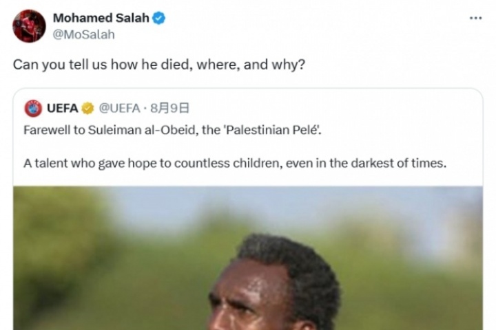 體育資訊08月10日訊 歐足聯(lián)官方此前發(fā)文,向不幸喪生的巴勒斯坦球星奧貝德簡短致哀。利物浦球星薩拉赫轉發(fā)了這則帖文,并發(fā)出了三個疑問。