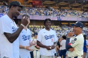 視頻中,三人身穿美國(guó)職業(yè)棒球大聯(lián)盟(MLB)球隊(duì)洛杉磯道奇的球衣,來(lái)到道奇的主場(chǎng)參加活動(dòng)。