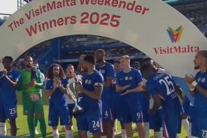 賽后,切爾西隊(duì)長詹姆斯代表球隊(duì)領(lǐng)取了季前賽獲勝的冠軍獎杯。