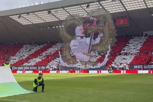 體育資訊8月16日訊 桑德蘭回歸英超后迎來(lái)首戰(zhàn),與西漢姆的比賽正在進(jìn)行當(dāng)中,黑貓球迷們打出巨幅TIFO,給球隊(duì)打氣。