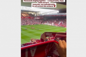 她隨后分享了兩張數(shù)千名球迷手持圍巾、橫幅和旗幟向已故兄弟致敬的照片,并配文“多么令人自豪的地方!這就是利物浦!”并感謝所有球迷。