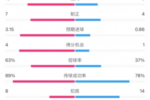 體育資訊1月21日訊 英超第22輪,切爾西3-1狼隊(duì)。兩隊(duì)全場(chǎng)數(shù)據(jù)(切爾西在前):