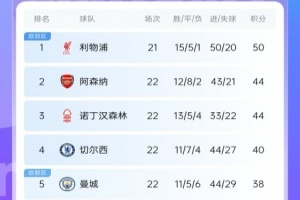 最新英超積分榜形勢(shì)如圖所示: