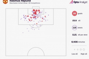 數(shù)據(jù)網(wǎng)站OPTA也盤點了霍伊倫曼聯(lián)生涯射門效率情況,他在各項賽事6406分鐘登場時間中完成115次射門,打進26球,平均每246分鐘打進一球。
