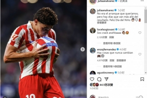阿爾瓦雷斯社媒曬出慶祝進球的照片,配文:“這不是我們想要的開局,但有一些日子超越了比賽結(jié)果,兒童節(jié)快樂!”