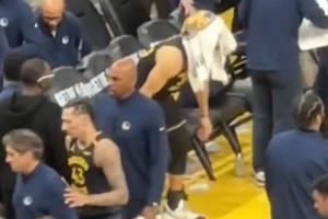 賽后,庫里坐著場邊一臉懵,之后與下場的替補球員擊掌。