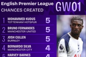 體育資訊8月20日訊 新賽季英超首輪比賽已經(jīng)結(jié)束了全部爭奪,根據(jù)Squawka的數(shù)據(jù)統(tǒng)計,庫杜斯、布魯諾-費爾南德斯以及約什-庫倫并列創(chuàng)造機會最多球員。值得一提是,庫杜斯首次在英超中單場送出兩次助攻。