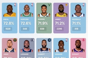 奧尼爾,籃下命中率72.8%,籃下出手1529次;