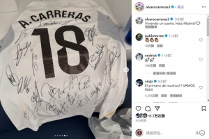 今夏加盟皇馬的A費此役踢滿全場,幫助球隊取勝,他在社交媒體上曬出首秀球衣,上面簽滿了隊友的名字。