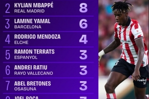 體育資訊8月21日訊 近日,數(shù)據(jù)機構Squawka統(tǒng)計了西甲聯(lián)賽首輪突破次數(shù)最多的球員榜,尼科-威廉姆斯、姆巴佩和亞馬爾是唯一在首輪比賽中完成5次以上過人的球員。