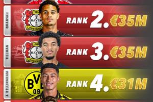 4、喬布-貝林厄姆,桑德蘭→多特,3100萬歐