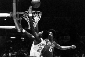 1976年J博士君臨費(fèi)城,之后七年,費(fèi)城四進(jìn)總決賽,兩進(jìn)東部決賽,1979年分區(qū)半決賽3比4輸給冰人領(lǐng)銜的馬刺已算最差。1983年,費(fèi)城完成摩西·馬龍預(yù)言的“4!4!4!”,橫掃紐約,4比1破雄鹿,總決賽橫掃湖人奪冠。