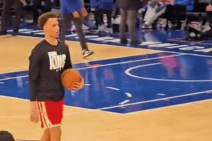 本場比賽,崔永熙現(xiàn)身麥迪遜廣場花園看球,并與戴森-丹尼爾斯寒暄。