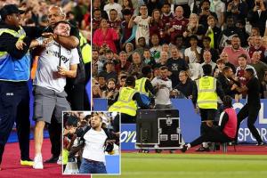 社交媒體用戶稱,當(dāng)藍(lán)軍攻入本場第五球后,有一名年輕的西漢姆球迷成功闖入球場。在主隊遭遇恥辱之夜的同時,數(shù)千名憤怒的西漢姆球迷被拍到提前離場。