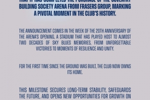 俱樂部公告寫道:“考文垂足球俱樂部欣喜宣布,已完成從弗雷澤集團(tuán)收購考文垂建筑協(xié)會(huì)競技場的交易,這標(biāo)志著俱樂部歷史上一個(gè)決定性時(shí)刻?!?/p>
