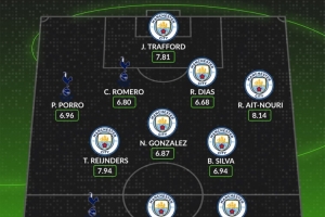 WhoScored根據(jù)球員上賽季至今的場均評(píng)分列出了曼城+熱刺陣容,哈蘭德、庫杜斯在列,熱刺僅3人入選。