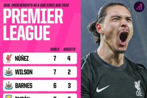 據(jù)Opta統(tǒng)計,努涅斯2022-2023賽季以來聯(lián)賽替補出場參與11粒進球,英超球員同期最多。