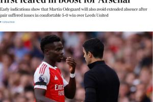在昨日英超阿森納5-0擊敗利茲聯(lián)的比賽中,薩卡和厄德高雙雙因傷離場(chǎng),引發(fā)眾多槍迷擔(dān)憂。主帥阿爾特塔在賽后曾表示,薩卡的傷情可能“不樂觀”。