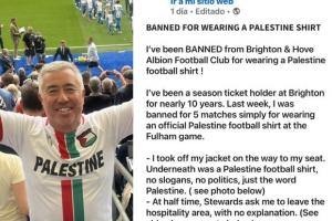 “我是布萊頓近10年的季票持有者。上周,因為在對陣富勒姆的比賽中穿了一件巴勒斯坦官方足球球衣,我被禁賽5場?!?/p>