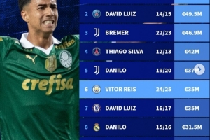 體育資訊1月21日訊 曼城官方宣布簽下雷斯,轉(zhuǎn)會(huì)費(fèi)3500萬歐。德轉(zhuǎn)也盤點(diǎn)了巴西后衛(wèi)歷史轉(zhuǎn)會(huì)費(fèi)最高榜單,具體如下: