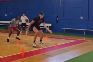 視頻中,克林根和小個(gè)球員一起進(jìn)行腳步訓(xùn)練,開拓者官博配文道:“??6尺vs7尺,來和大根一起練練腳步。”