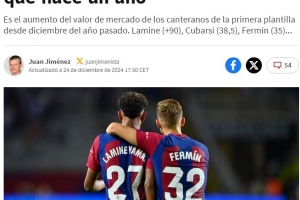 亞馬爾從去年的6000萬(wàn)歐元身價(jià)暴漲至1.5億歐元,庫(kù)巴西從從前的150萬(wàn)歐元暴漲至4000萬(wàn)歐元,費(fèi)爾明的身價(jià)也漲至5000萬(wàn)歐元。
