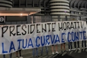 國米球迷組織北看臺(tái)拉出橫幅,為莫拉蒂送上祝福,上面寫著:“莫拉蒂主席,你的北看臺(tái)與你同在?!?/p>