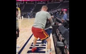賽前,前NBA球員賈馬爾-尼爾森現(xiàn)身掘金主場,約基奇與他進行互動寒暄。