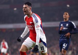 阿森納首發(fā):1-拉亞、2-薩利巴、6-加布里埃爾、12-廷伯、33-卡拉菲奧里、23-梅里諾、41-賴斯、36-蘇維門迪、11-馬丁內(nèi)利、20-馬杜埃凱、14-約克雷斯